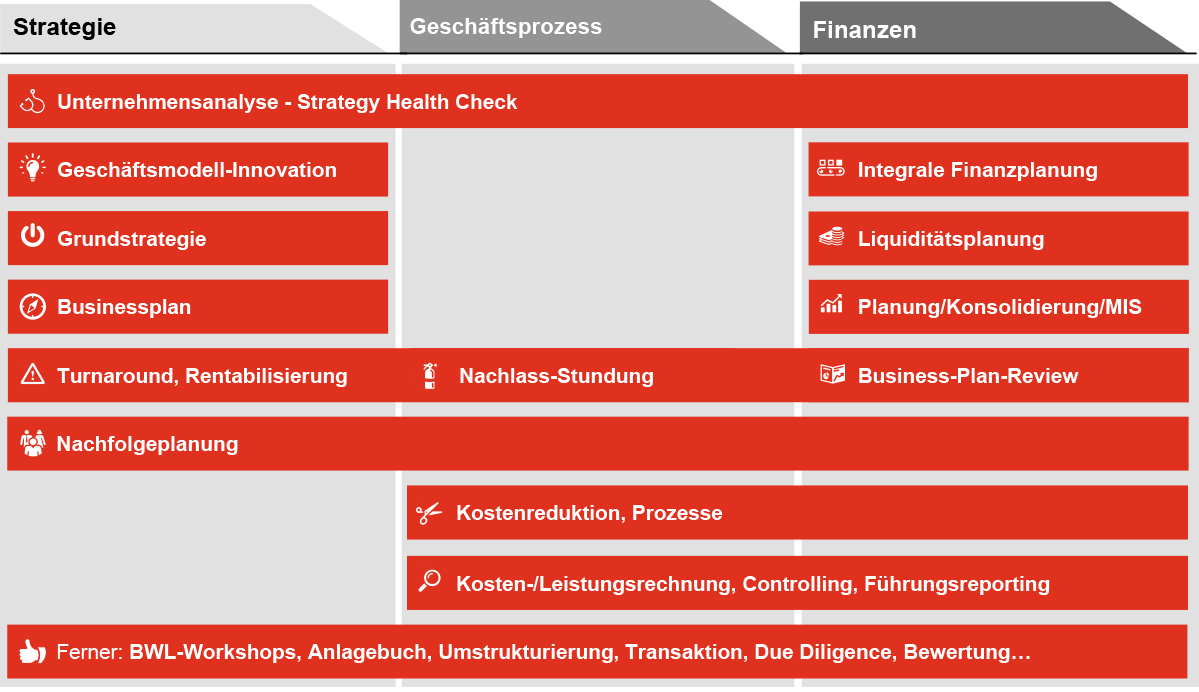 Unser spezialisiertes Team unterstützt Sie direkt aus der Region in Ihren strategischen und operativen Entscheidungen. Dabei bringen wir äusserst bewährte Module zielorientiert und vielfach in durchdachter Kombination mit dem besten Lösungsansatz für Sie zur Anwendung. Dabei orchestrieren wir selbstverständlich auch das Zusammenspiel von Unternehmen, Management, Eigentümer, Banken und – je nach Bedarf – öffentlicher Hand.